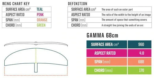 The Gamma 68cm is a user-friendly foil you can ride at slow speeds, surf the smallest wake or waves, or kite in super light wind. The Gamma 68cm is the wing of choice for our FWake package due to its flat profile, making it super stable from side-to-side. It has tons of lift for surfing wakes as small as a jetski ripple. For Windsurf Foil, the Gamma 68 is an easy entry level wing with low stall speeds that make it great for jibing, even if you bobble a bit. It has great upwind ability and overall stability.